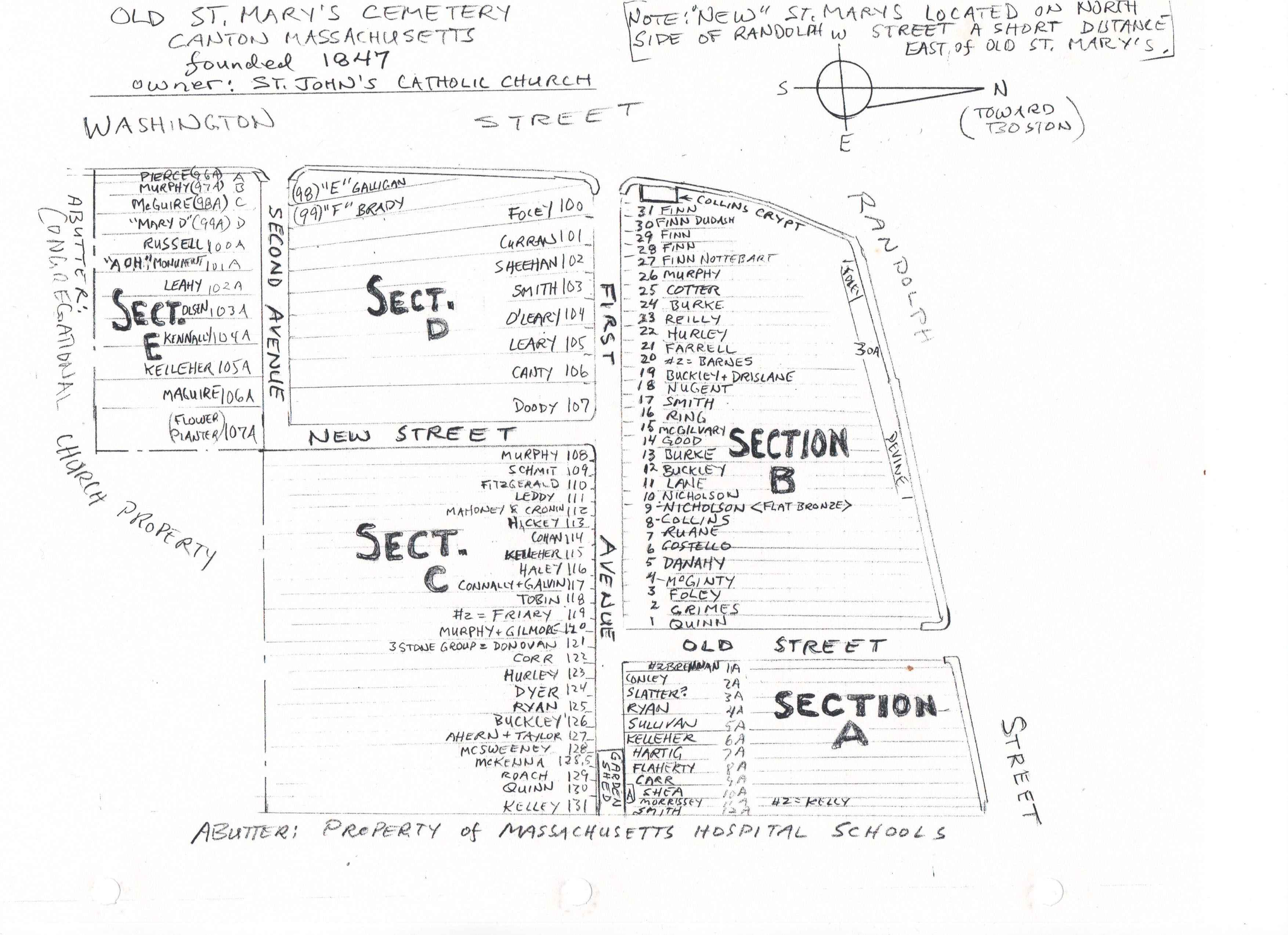 The following sketch-map is not to scale, but it approximates the layout and the range identities of the official map available at the custodian offices, St. John the Evangelist Catholic Church, 700 Washington Street. Canton, Massachusetts 02021.